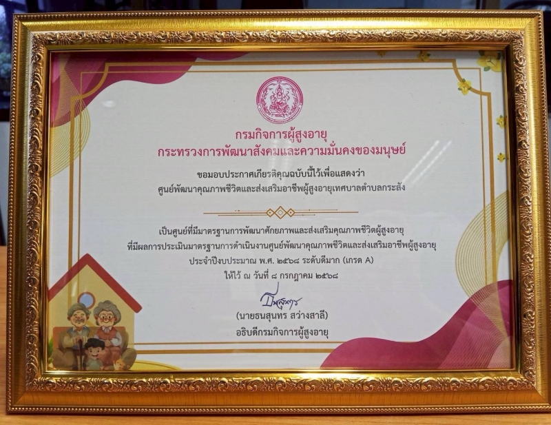 วันที่ 24 กันยายน 2568 เวลา 09.00 น. เทศบาลตำบลกระสัง นำโดย นายกรองเกียรติ ฉัตรพงศ์เจริญ รองนายกเทศมนตรีตำบลกระสัง และทีมงานกองสวัสดิการสังคม เข้ารับใบประกาศเกียรติคุณยกย่องศูนย์พัฒนาคุณภาพชีวิตและส่งเสริมอาชีพผู้สูงอายุ (ศพอส.) ดีเด่น ที่มีผลการประเมินมาตรฐานระดับดีมาก (เกรด A) ประจำปี 2568 โดยรับมอบจาก นายปิยะ ปิจนำ ผู้ว่าราชการจังหวัดบุรีรัมย์ ในการประชุมคณะกรมการจังหวัดบุรีรัมย์ ณ หอประชุมจังหวัดบุรีรัมย์ ศาลากลางจังหวัดบุรีรัมย์